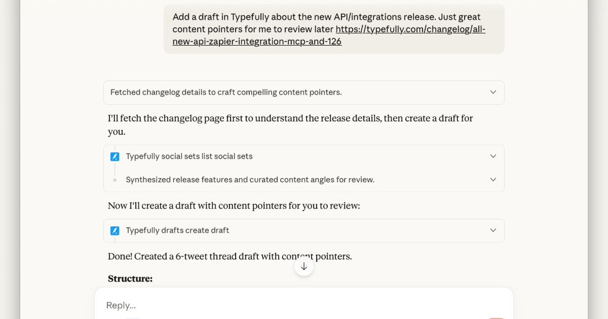 Connect your favorite AI assistant to Typefully and manage your social media content through natural conversation. Create posts, schedule content, and manage your queue—all without leaving your AI chat.
